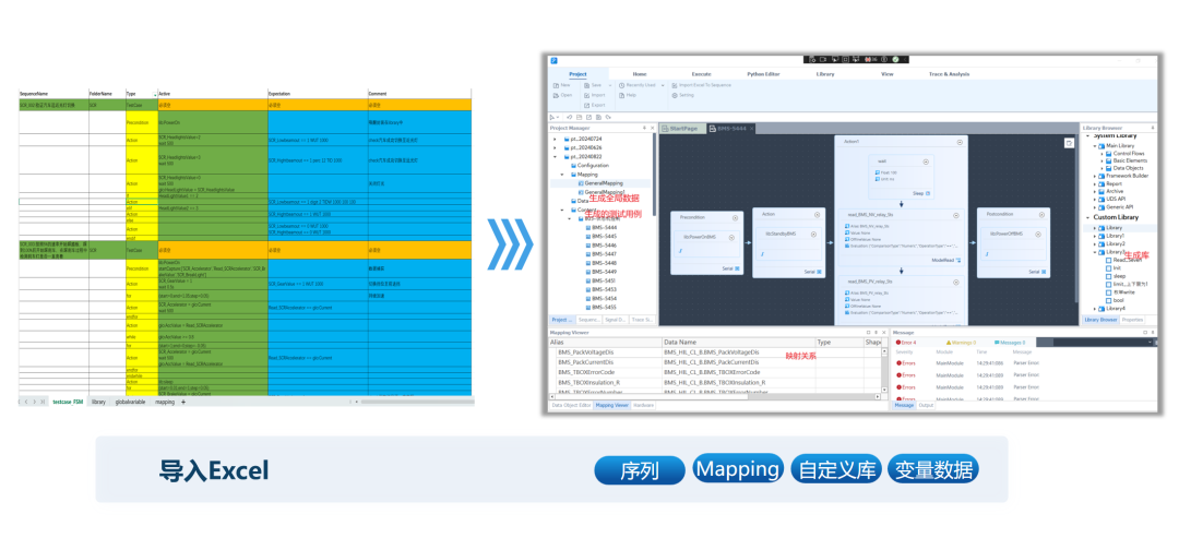 支持Excel导入自动生成测试序列的功能,提供Excel模板、语法规范和源码,且支持导入信号映射文件、自定义库、全局变量;序列中支持多种逻辑分支结构,支持信号赋值与读取评估、信号重置、全部评估逻辑、信号记录等;E2S功能支持HIL功能测试、ECU标定测试、CAN通讯测试等;支持AI语法检查。